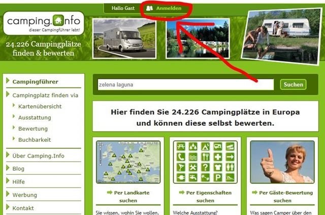 Zum Anmelden oder neu registrieren auf Camping.Info klickt Ihr einfach ganz oben auf der Seite auf “Anmelden”: