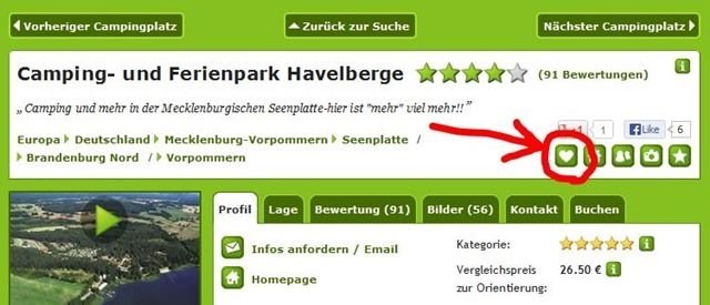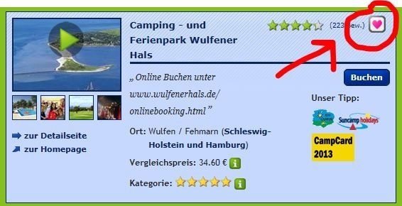 Wenn Ihr bei einem Platz auf das Herz klickt (in der Suchergebnisliste oder auf der Detailseite eines Campingplatzes), wird dieser Betrieb in Eure Merkliste gestellt: