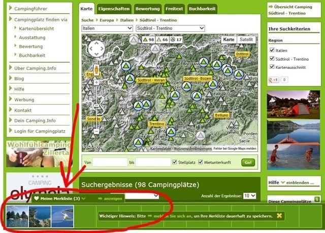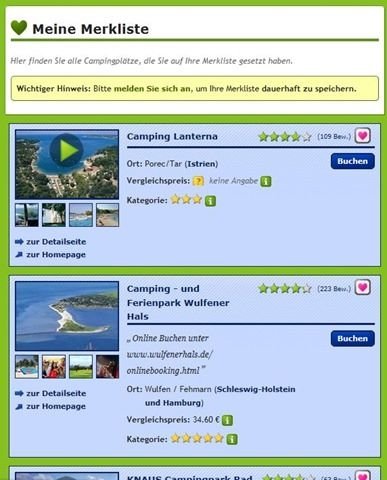 Das kommt darauf an: Wenn Ihr NICHT auf Camping.Info eingeloggt seid, dann kann unser Server Eure Merkliste nur so lange speichern, so lange das Sitzungs-Cookie aktiv ist. Das heißt in der Praxis meist: Sobald Ihr den Browser (Internet Explorer, Firefox …) schließt und wieder neu öffnet, kann es sein, dass die Merkliste weg ist.